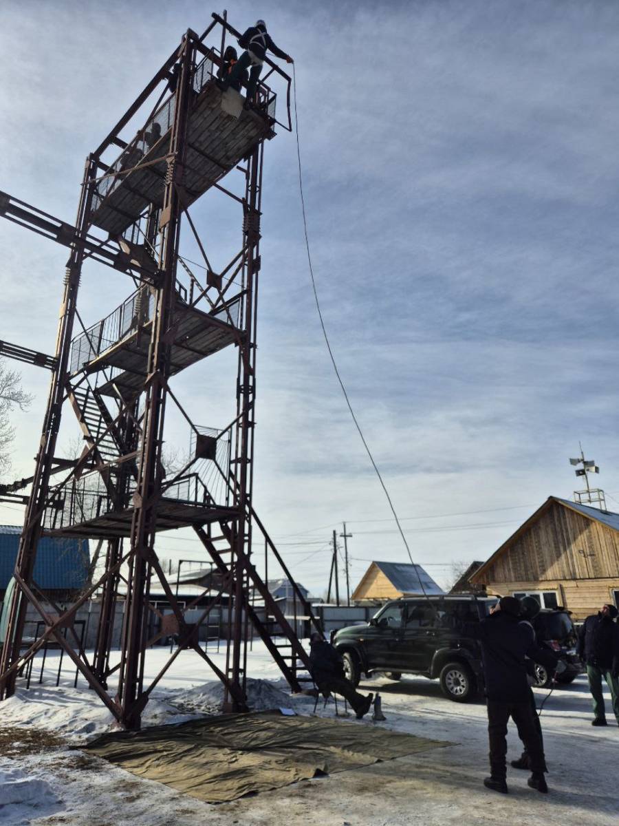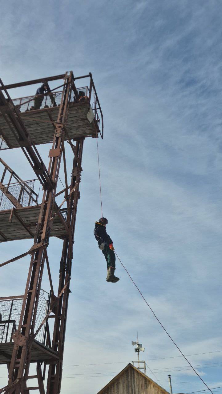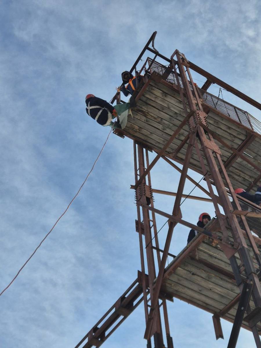 Сейчас обучающиеся закрепляют навыки спуска на вышке-тренажере. С помощью спускового устройства Кашевника КС-К/2, они плавно спускаются по шнуру с двенадцатиметровой высоты, оттачивая все движения до автоматизма.